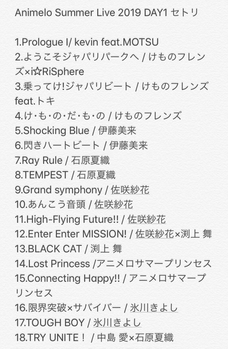 アニメイトタイムズ2018年8月24日金26日の3日間さいたまスーパーアリーナにて開催中のAnimelo Summer Live 2018 OKより3日間すべてのセットリストが公開となりました 3日間のセットリストをまとめてご紹介目次1日目セットリスト2日目セットリスト.