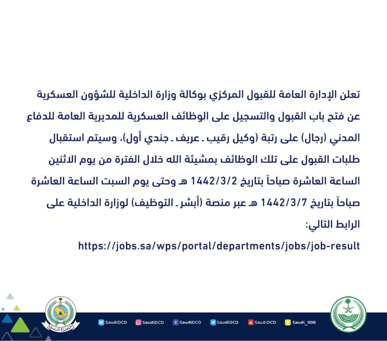 الدفاع المدني السعودي Twitterissa تعلن الإدارة العامة للقبول المركزي بوكالة وزارة الداخلية للشؤون العسكرية عن فتح باب القبول والتسجيل على الوظائف العسكرية للمديرية العامة للدفاع المدني رجال على رتبة وكيل رقيب ـ